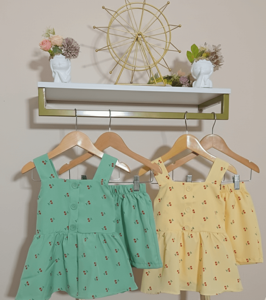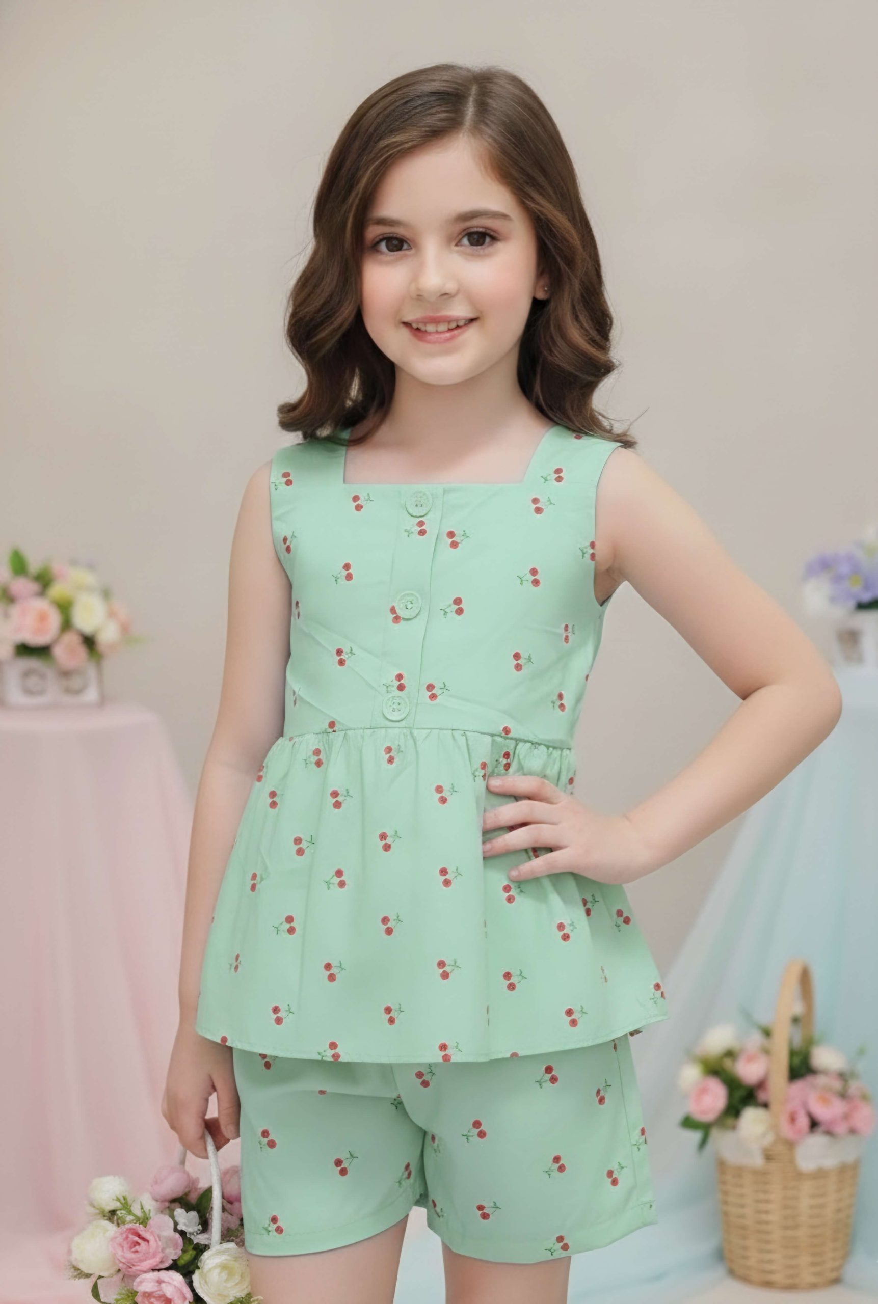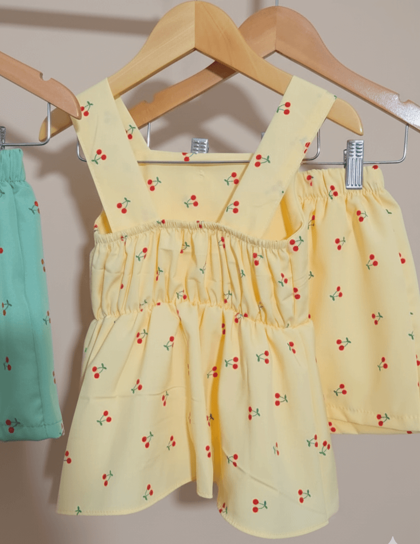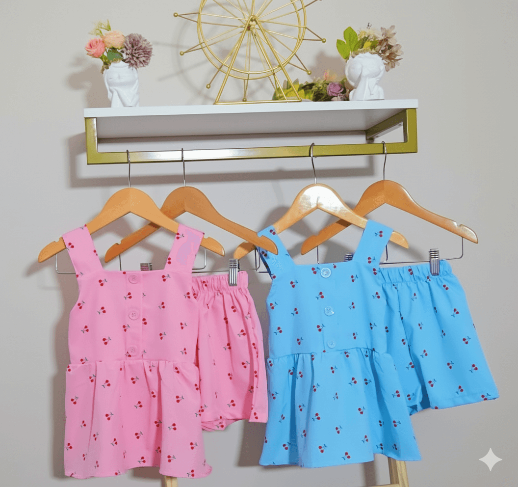 Conjunto super fofo e fresquinho. A blusa estilo bata tem um caimento leve, complementada por um short confortável que garante total liberdade de movimento. Tecido crepinho Leve e macio, Detalhe: Estampa exclusiva de cerejas e botões delicados na blusa.