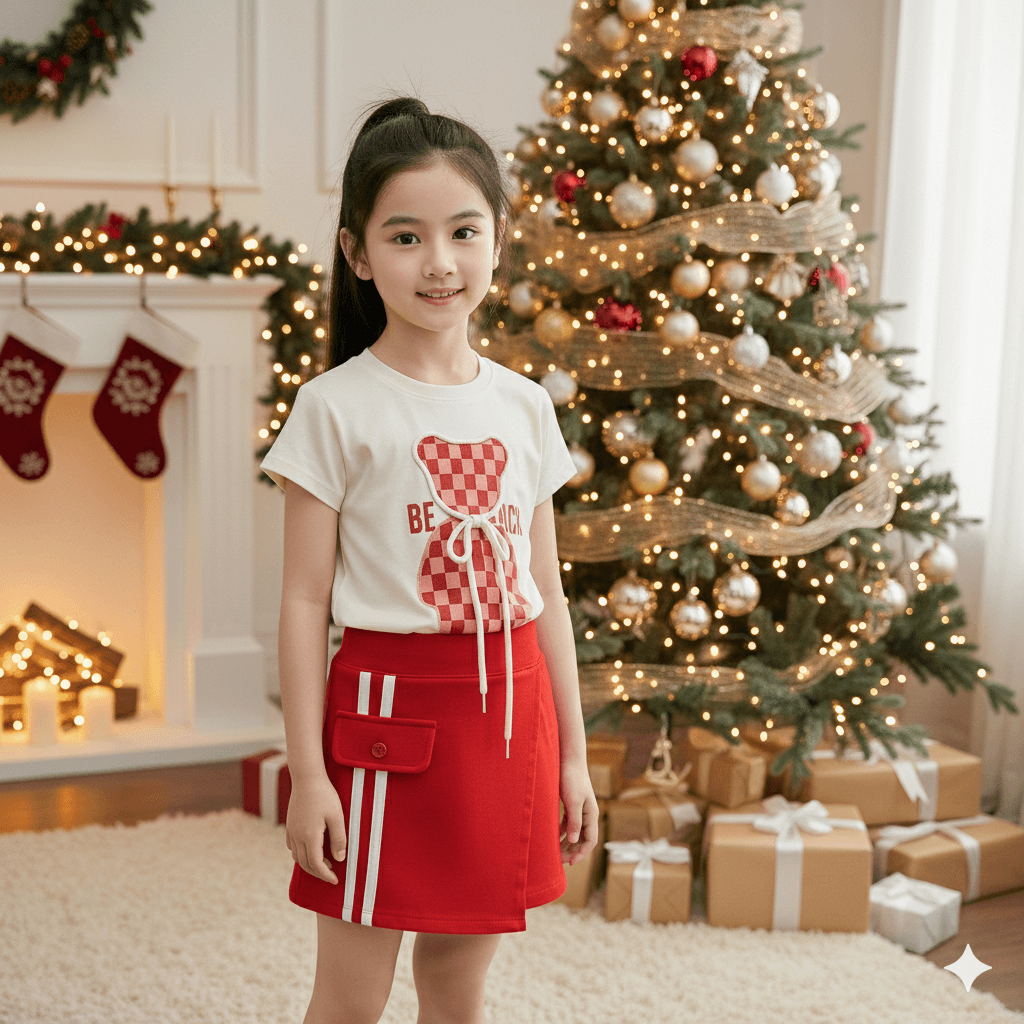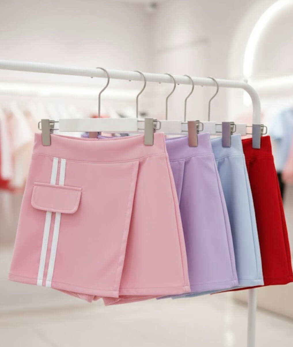Short saia confeccionado em tecido alfaiataria baby com detalhe de listras na saia , elastico no cos da cintura parte de trás para melhor ajuste