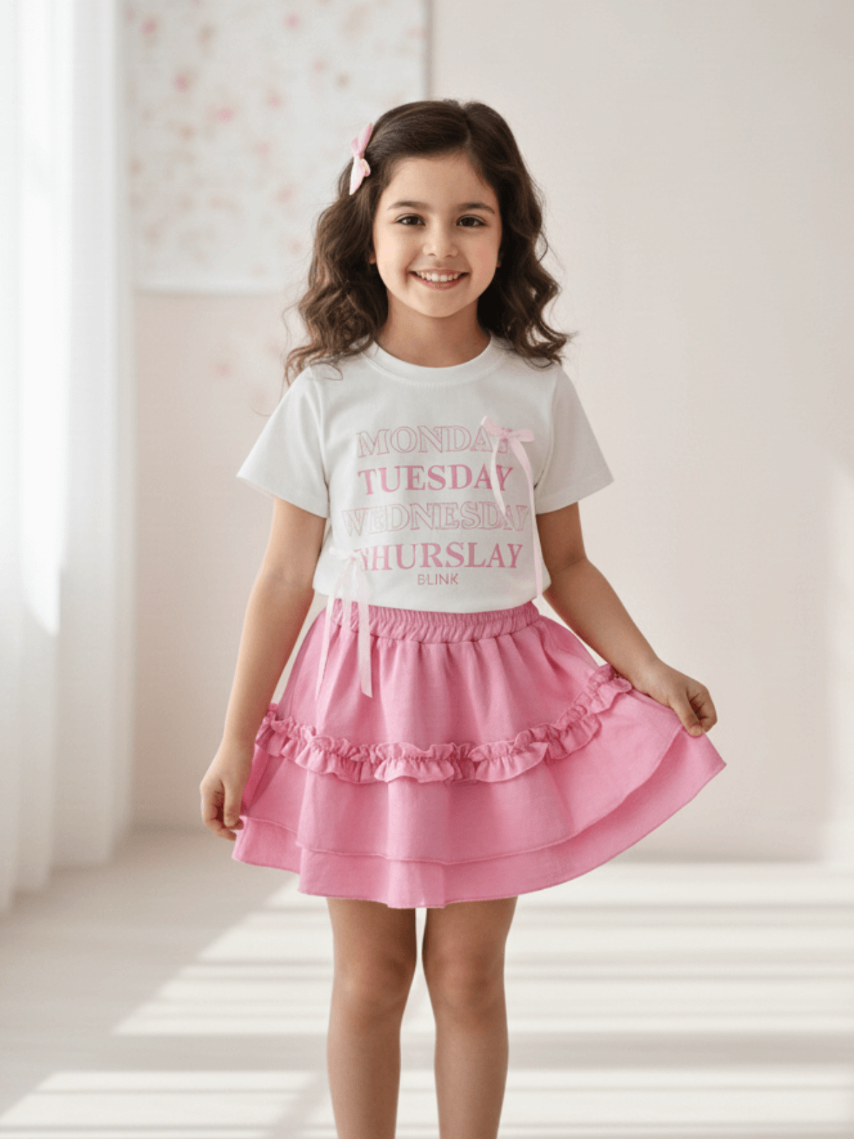 T-shirt em malha peruana, com toque macio, alta durabilidade e excelente respirabilidade. Possui estampa delicada e aplicação de laços, garantindo conforto, ótimo caimento e acabamento de qualidade.
