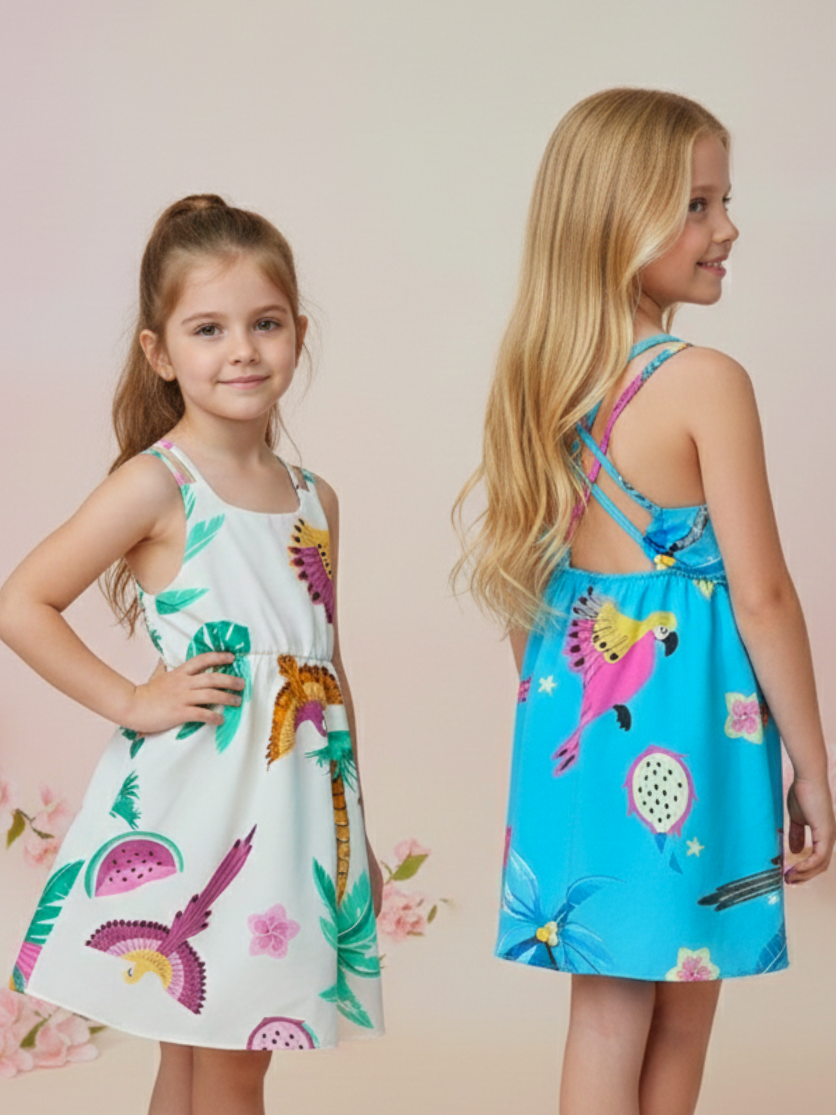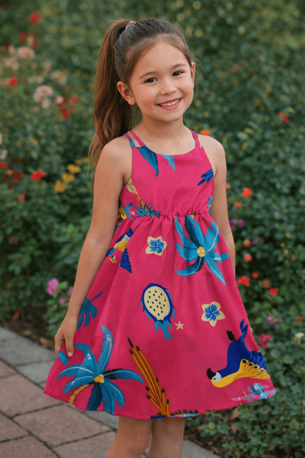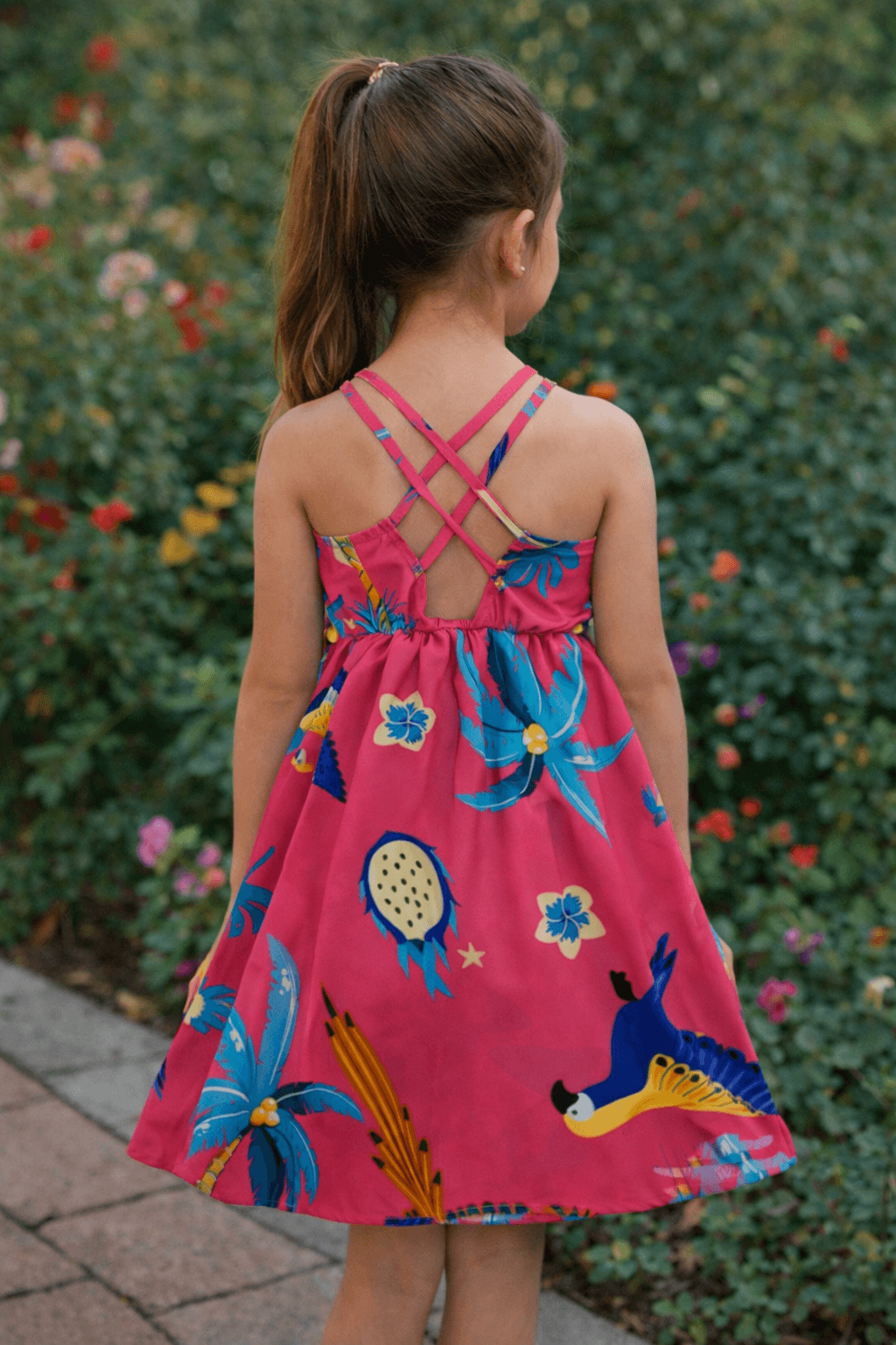 Vestido infantil com estampa estilo Farm, inspirado no tropical brasileiro