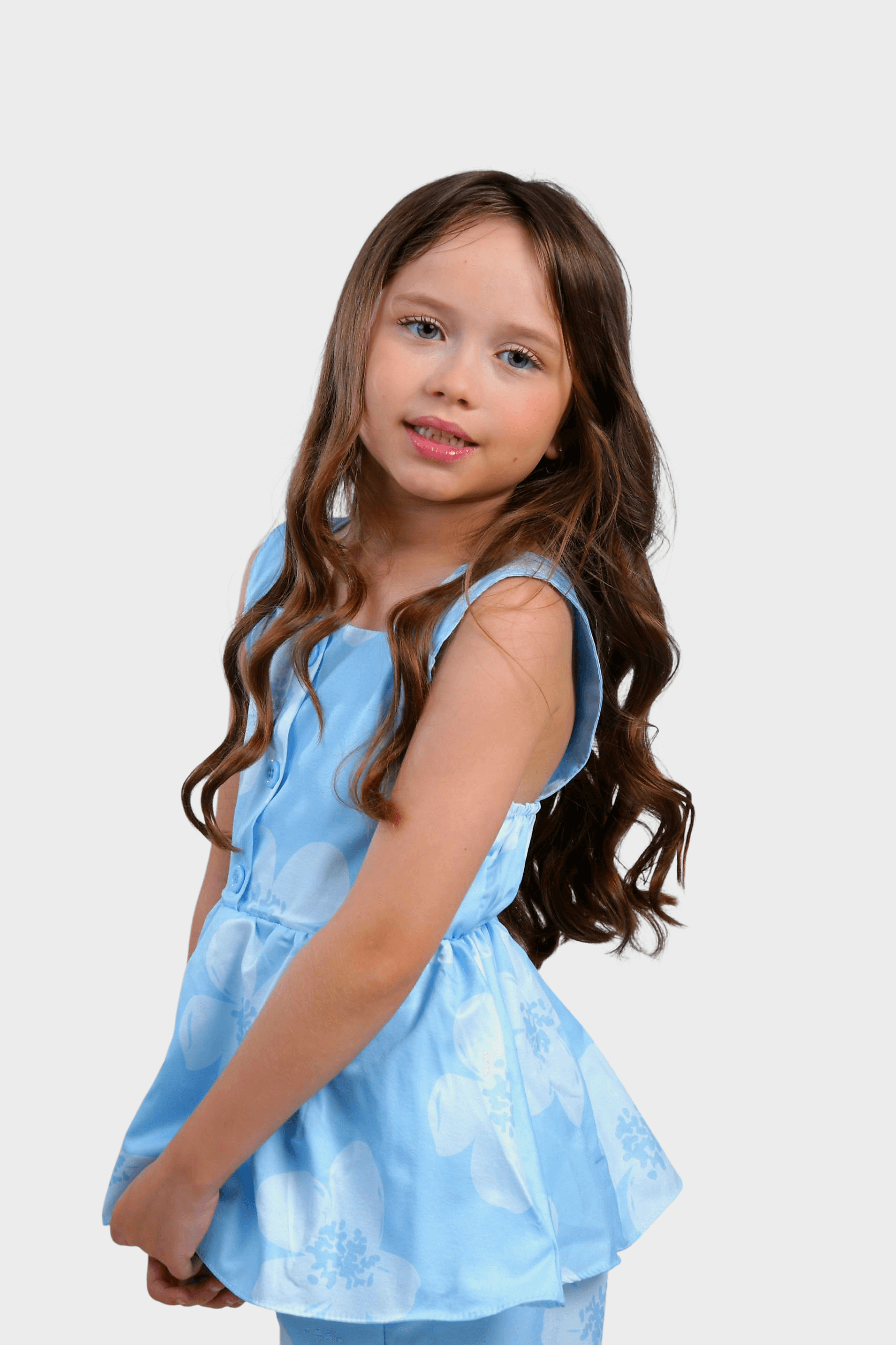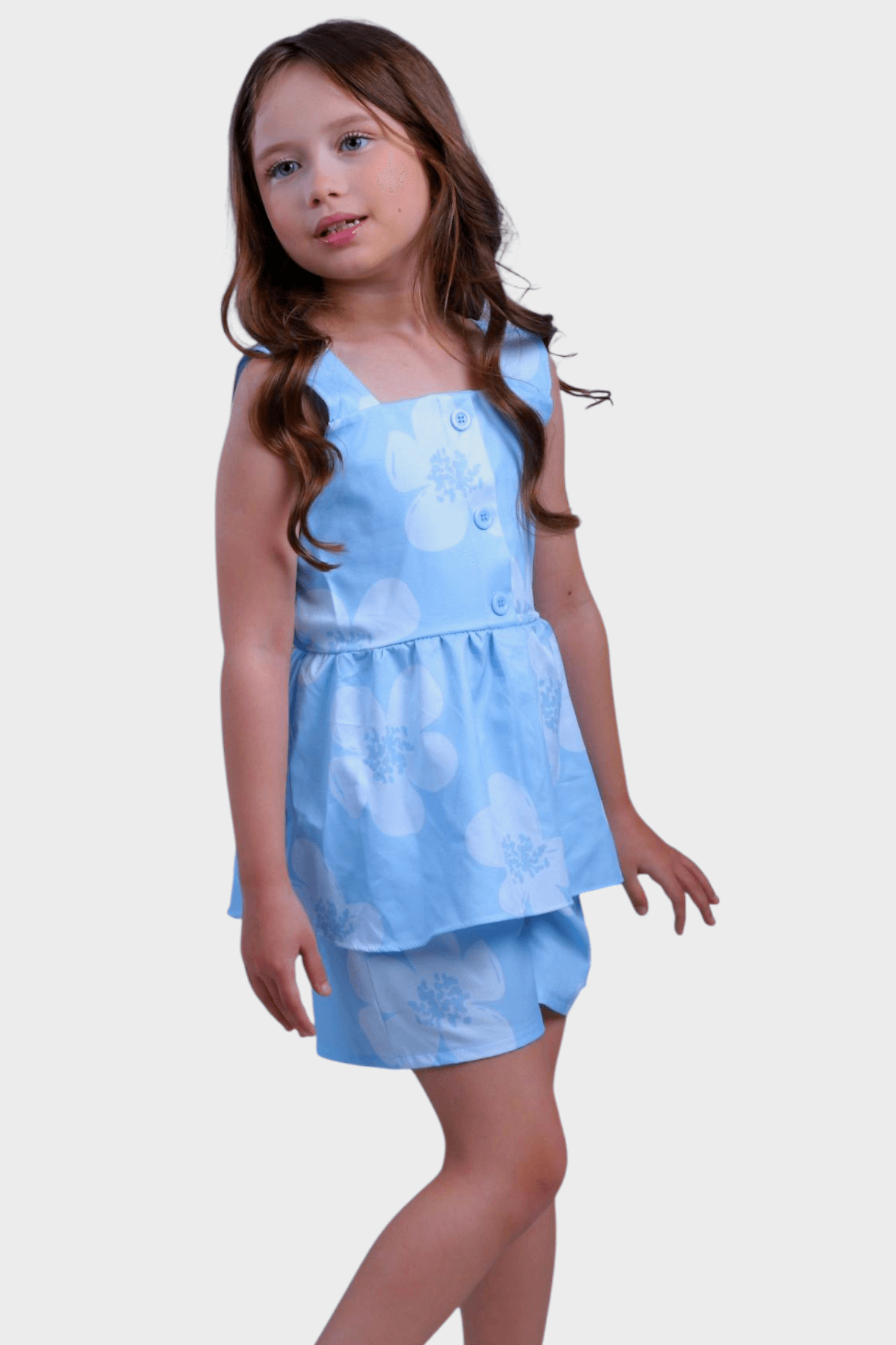 Conjunto rose confeccionado em tecido crepinho estampado floral nas cores candy .